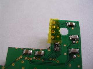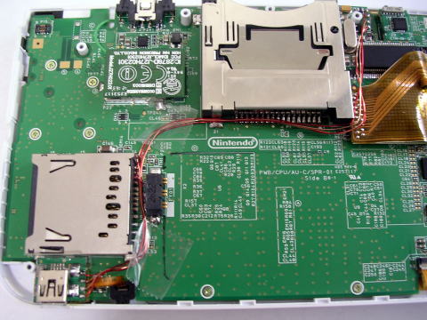 スライドパットの仮止めセロテープを外して、LL-SPA3基板をゲームカートリッジコネクタ横の穴にはめ込みます。