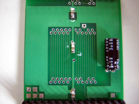 裏面には0.1uFのチップコンデンサ(4こぐち)と100uFの電解コンデンサを取り付けます。