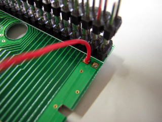 GBAカートリッジ基板にピンヘッダを取り付る際は、少し外側に倒した状態で半田付けします。
