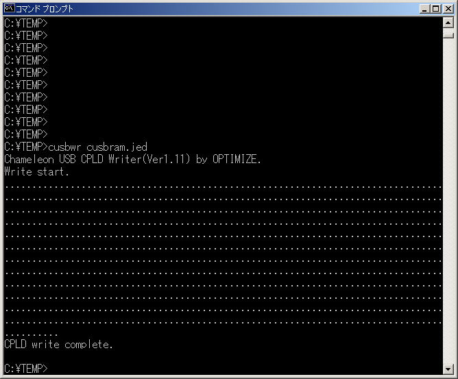 Windowsのコンソール画面(DOS窓)から「cusbwr cusbram.jed」と実行します。