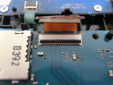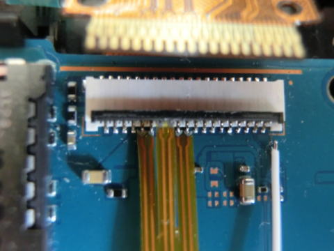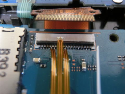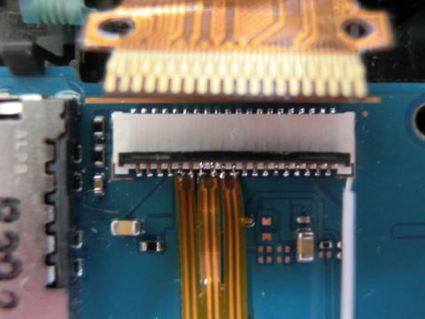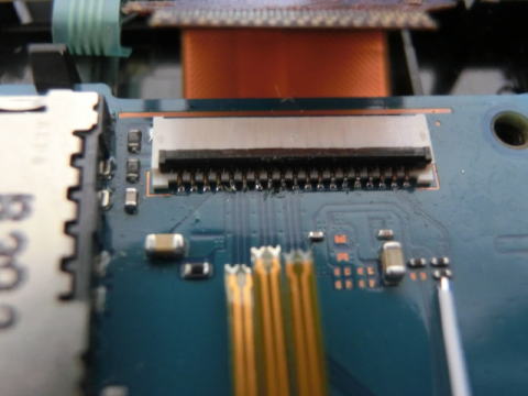 LCDフレキも背面タッチパネルのコネクタと同じ要領で、ツメを跳ね上げた状態で引き抜きます。