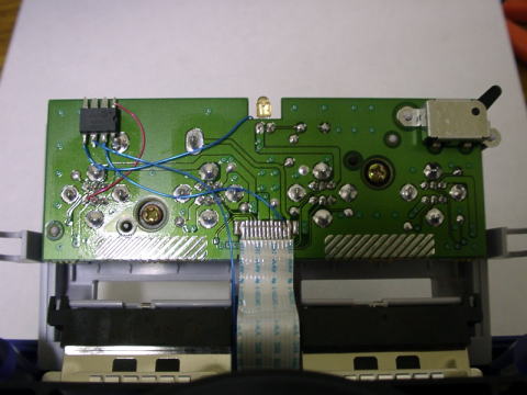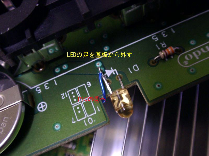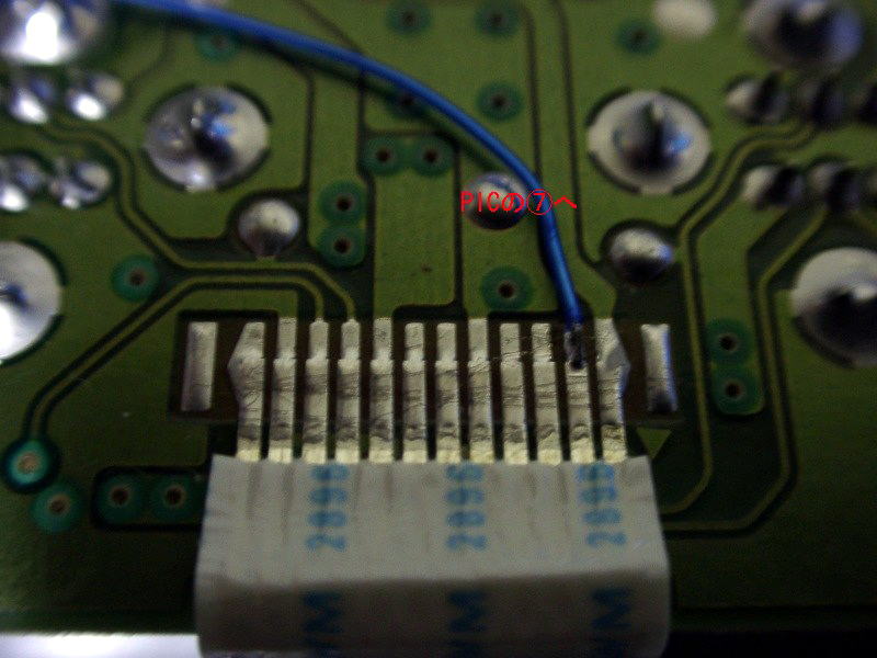 写真を良く見て、一番長いリード線をはんだ付けする。今回の改造の中で一番難しい部分ですので、落ち着いて慎重に行います。リード線の先端にも予めはんだを付着させておくと楽です。
