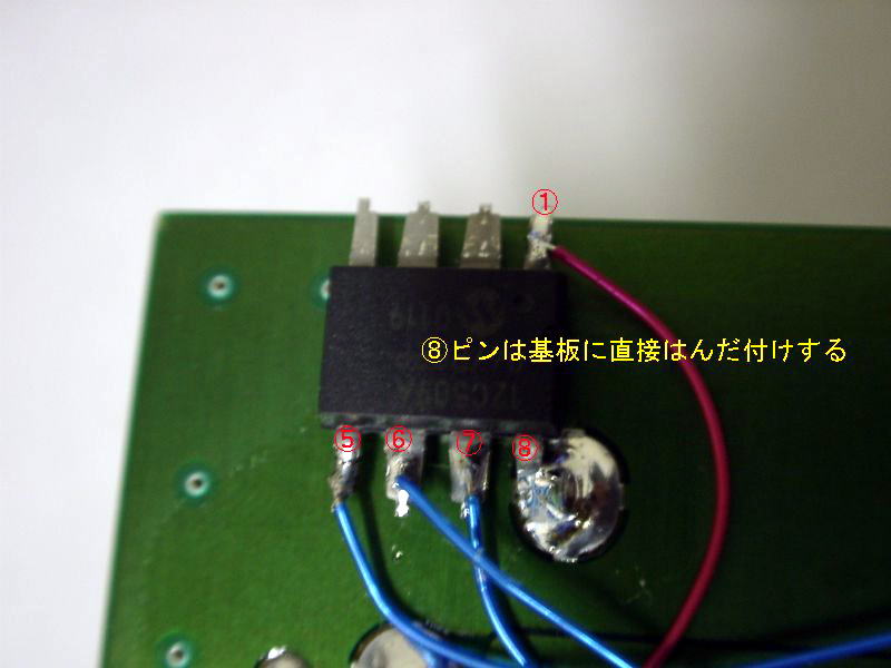 まずコントローラ基板にPICの8番ピンをはんだ付けします。