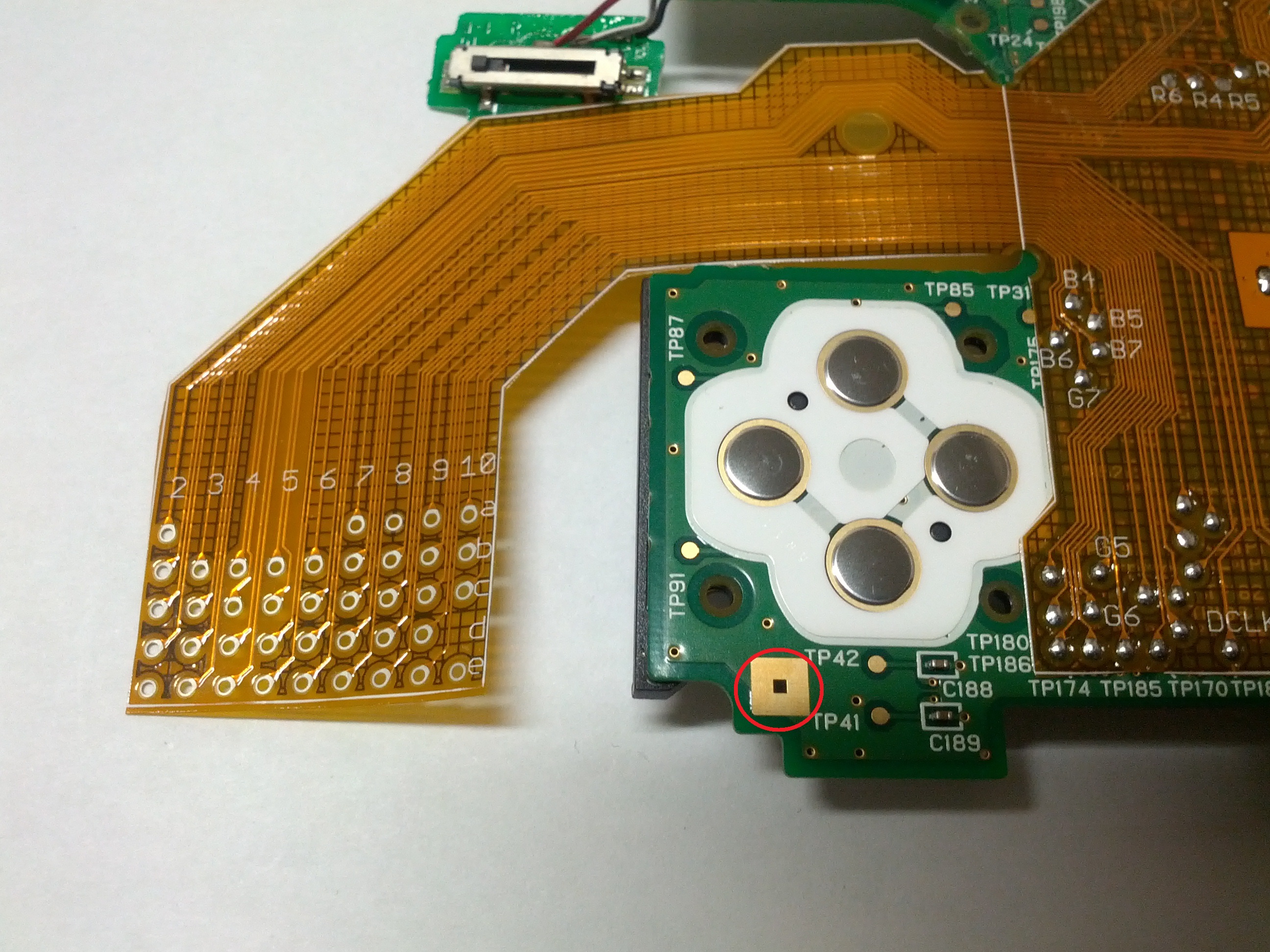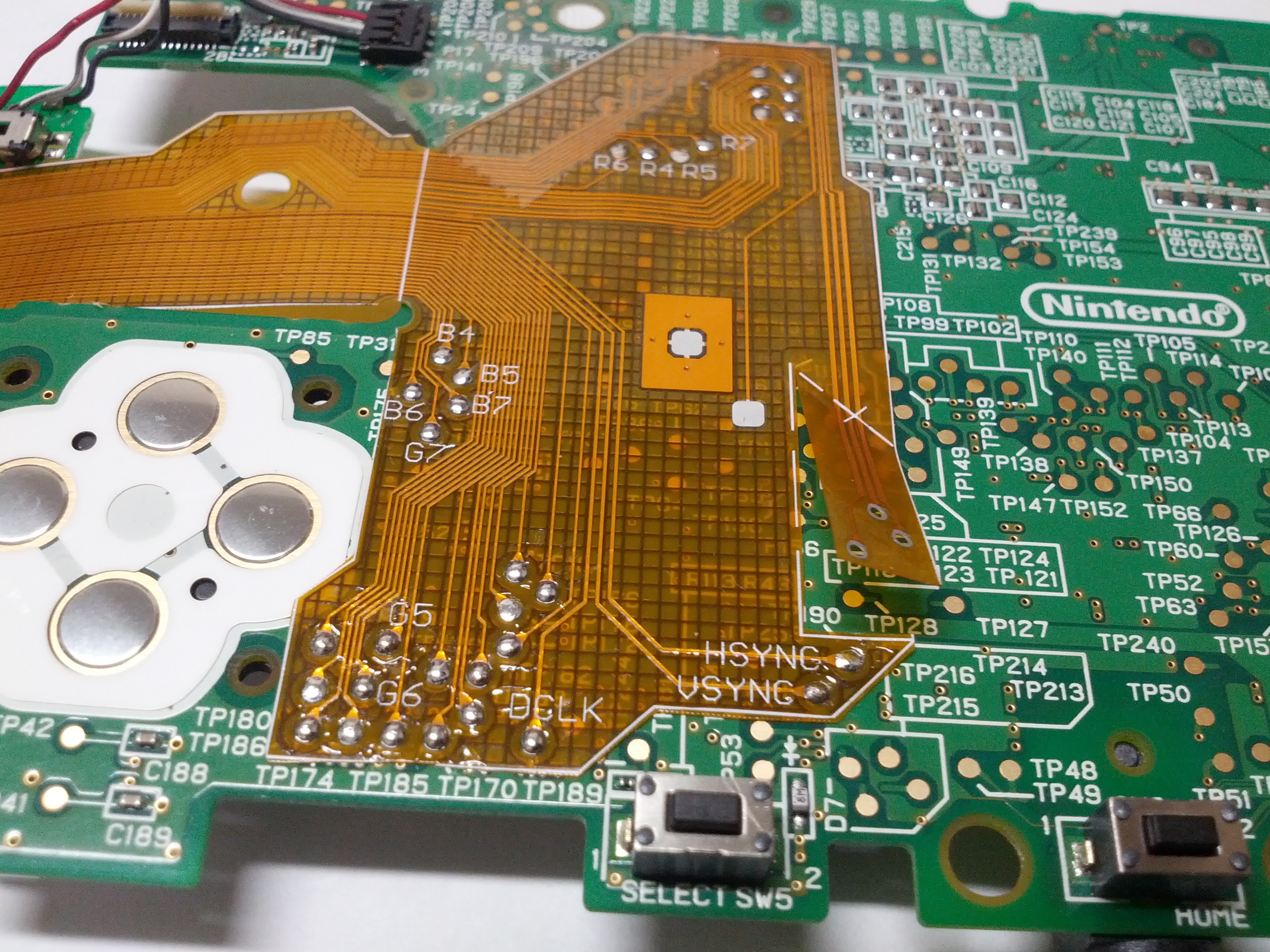 ゲーム機本体側のフレキの半田箇所に尖っている部分があり、それが液晶パネルのシャーシとショートしていることが考えられます。 |