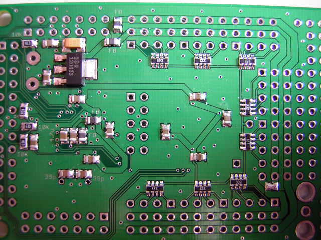集合抵抗は100Ω(101)を取り付けます。サーボ用のコネクタを実装すると、集合抵抗の再半田付けが難しくなりますので、コネクタを取り付ける前に、半田不良がないか十分に確認します。(テスターで確認すると良いです)