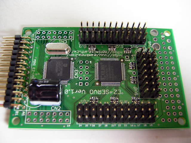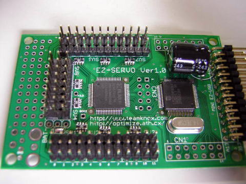 EZ-SERVOは高速(60MHz) 32bit ARM7 CPUを搭載した、32チャンネルR/Cサーボをコントロール可能なCPUボードです。2足歩行のロボットや、サーボを使用する制御ボードとして使用できます。TeamKNOxとの共同開発により誕生しました。