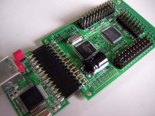キットにはmini EZ-USBとの接続用に26ピンL字タイプのピンヘッダが付属していますが、L字タイプを使用すると写真のようにピンが基板の外にはみ出します。はみ出すのが不都合な場合は、ストレートタイプのピンヘッダをお使いください。(完成品を注文の方はコメントにストレートピンヘッダ希望とご記入ください)