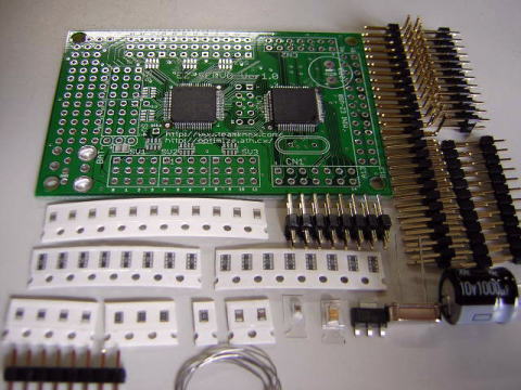 部品 数 備考 専用プリント基板 1 LPC2138、XC9572XL実装済み 3.3V 1Aレギュレータ 1 IRU1206-33 クリスタル 1 14.7456MHz タンタルコンデンサ 16V 10uF 1 極性あり チップコンデンサ 39pF 2 チップコンデンサ 4.7uF 1 チップコンデンサ 0.1uF 11 電解コンデンサ 10V 1000uF 1 極性あり チップビーズ(FB) 4 黒っぽい色をしている 集合抵抗 100Ω 8 101 集合抵抗 3.3KΩ 8 332 チップ抵抗 10KΩ 3 103 チップ抵抗 1KΩ 1 102 EZ-USB用L字アングル26Pヘッダ 1 L字コネクタは基板からはみ出します。