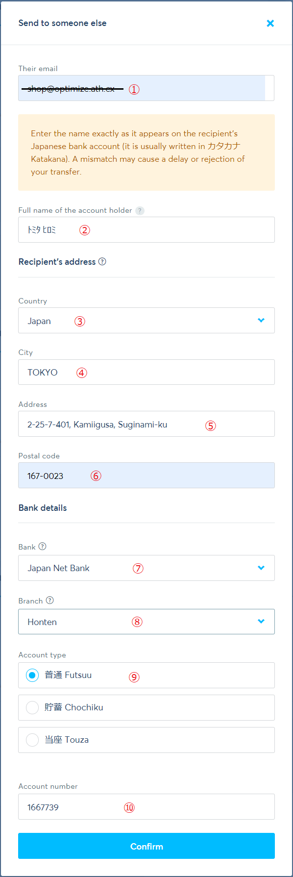 Please make sure that the transfer amount (JPY) matches the total order
