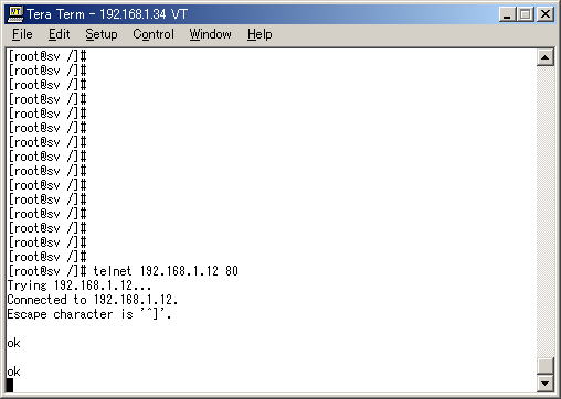 容量の関係でサンプルプログラムはWEBではありません。ポート80番でコネクトして、何らかのデータを送ると"ok"が返ってくるという単純なものです。動作確認にはtelnetで80ポートに接続してデータを送信(Enter)します。"ok"が返ってくれば正常です。